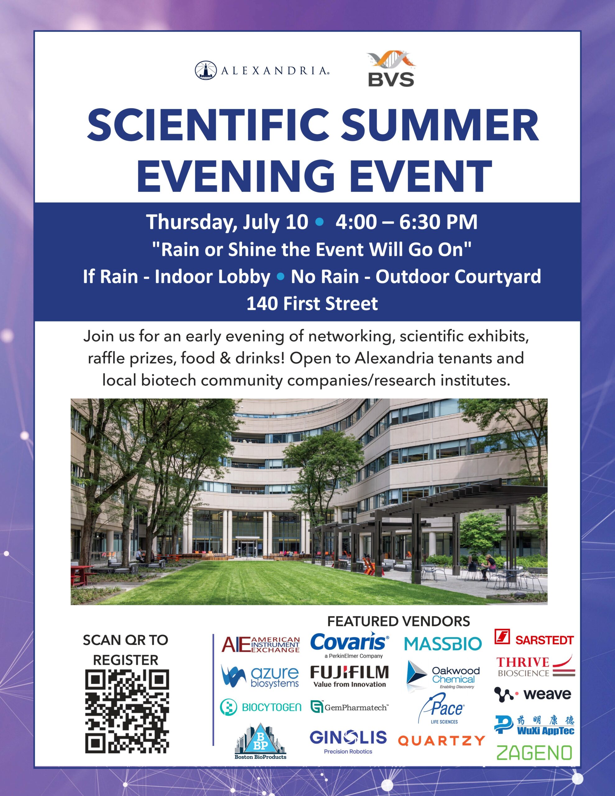 Alexandria Real Estate Equities in collaboration with BVS is hosting a Scientific Summer Evening Event at 140 First Street, Cambridge!
