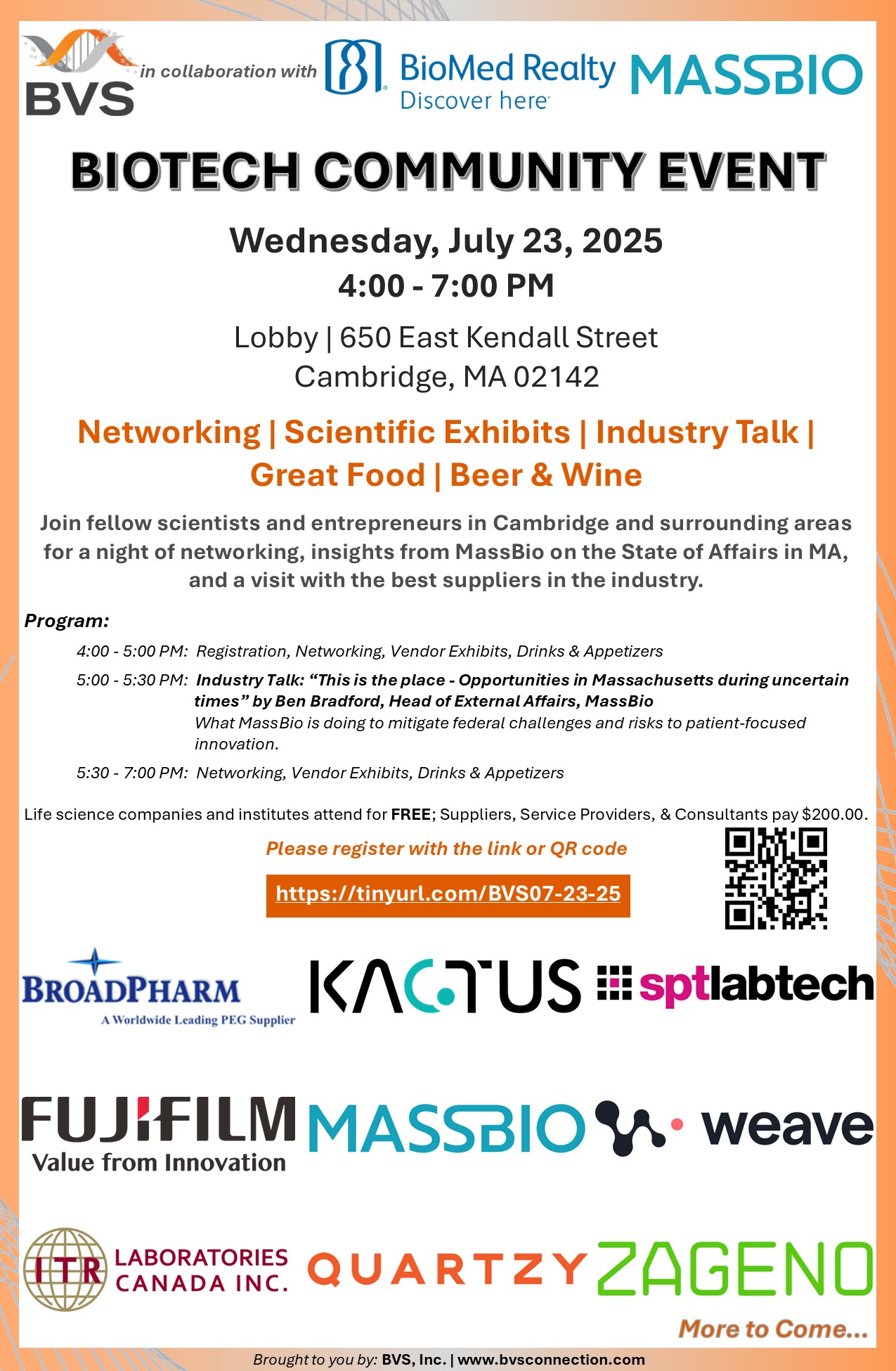 We are very excited to invite you to the BVS and BioMed Realty in Partnership with MassBio Biotech Community Event – State of Affairs in MA Talk and Vendor Expo in Cambridge!
