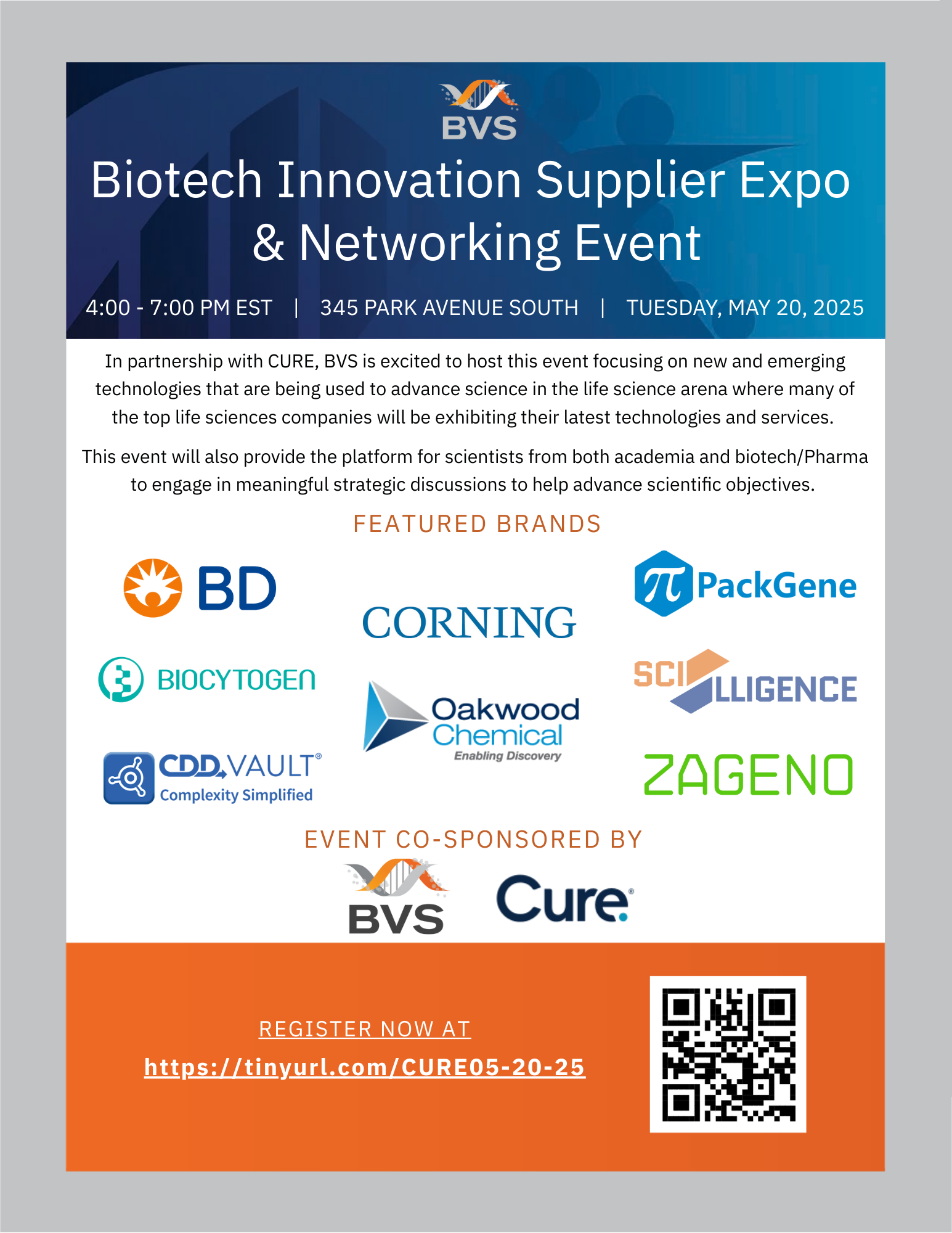 In partnership with CURE, BVS is excited to host a Biotech Innovation Supplier Expo and Networking Event in New York.