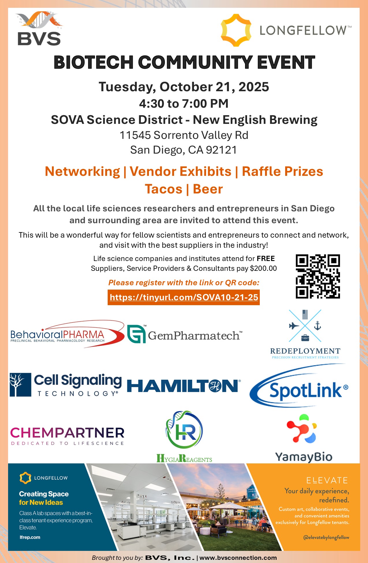 We are very excited to be hosting the BVS & Aquillius' Biotech Community Halloween Party and Vendor Expo. Mark your calendars for a great opportunity to connect with industry leaders, explore innovative products, and mingle with fellow professionals in the biotech community. We are inviting the entire San Diego Life Science Community to join us... |