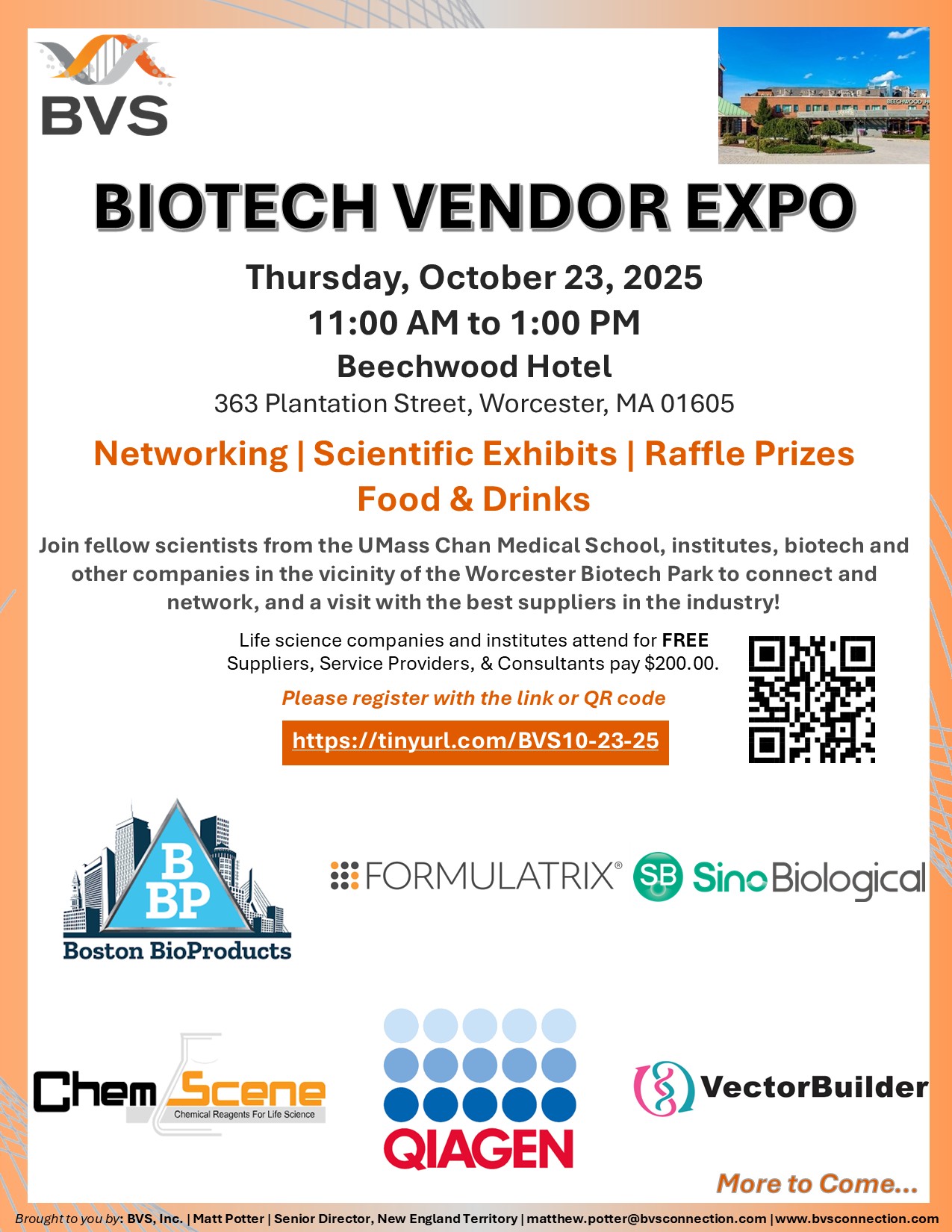 We are very excited to announce our indoor Vendor Expo and Biotech Community Event at the Beechwood Hotel on Plantation Street located directly across from UMass Medical Center in Worcester, MA. Mark your calendars for a great opportunity to connect with industry leaders, explore innovative products, and mingle with fellow professionals in the biotech community.... |
